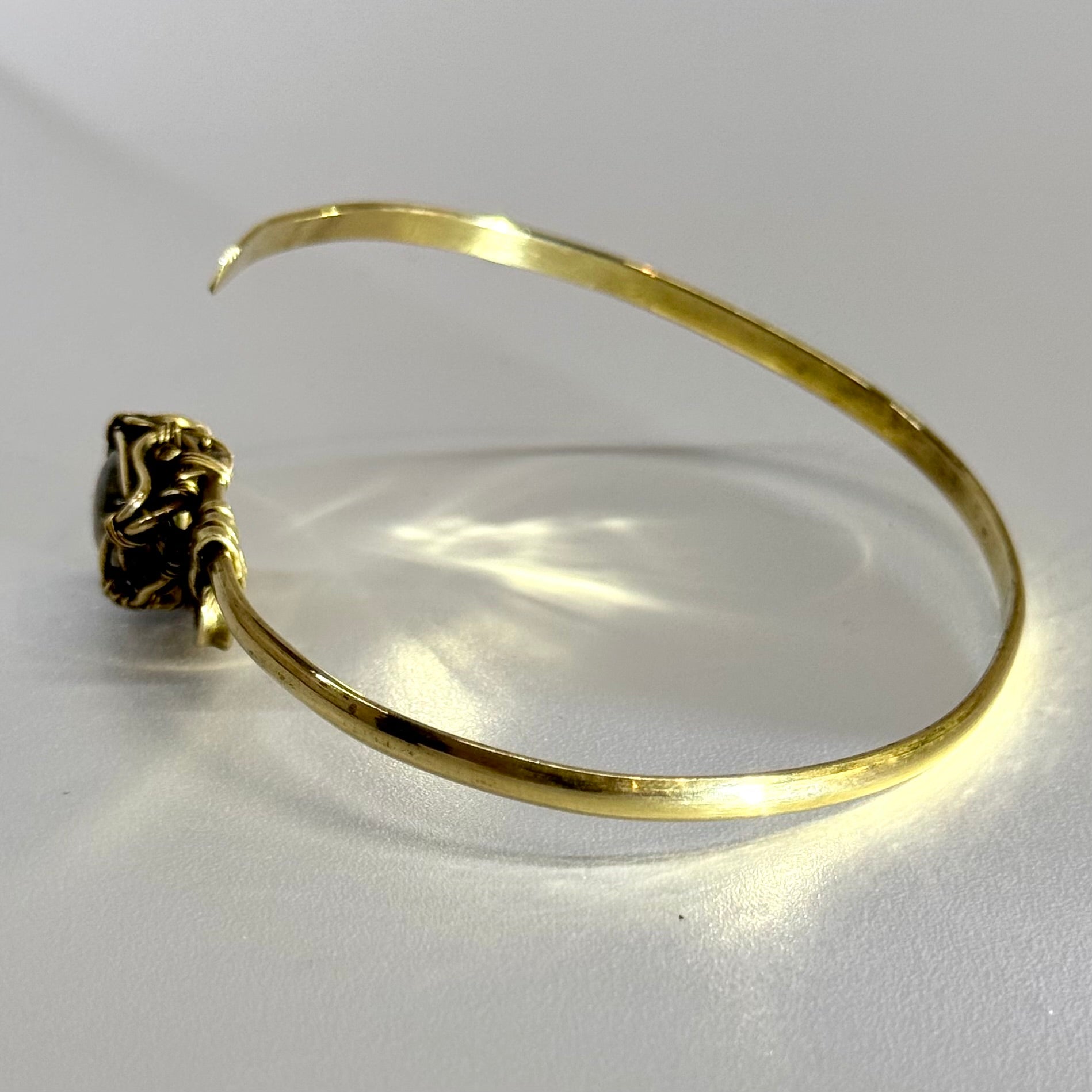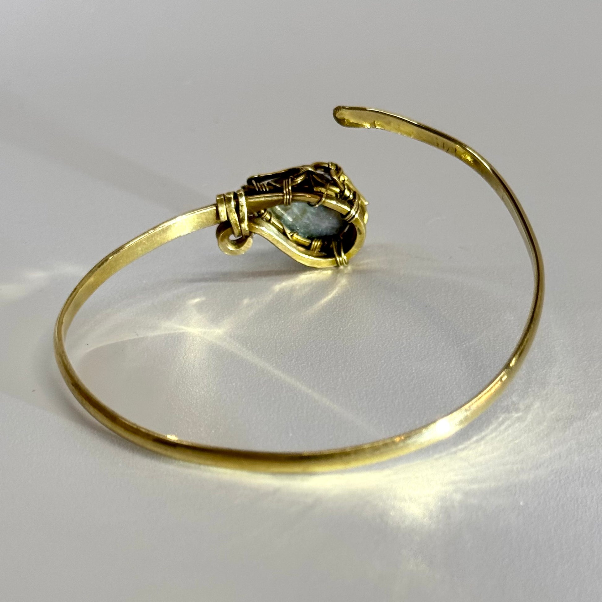 Ce magnifique bracelet est fabriqué à la main dans notre atelier de Playa del Carmen, au Mexique. Chaque pièce est soigneusement confectionnée en laiton, la pierre étant sertie à la main selon la technique du fil enroulé.