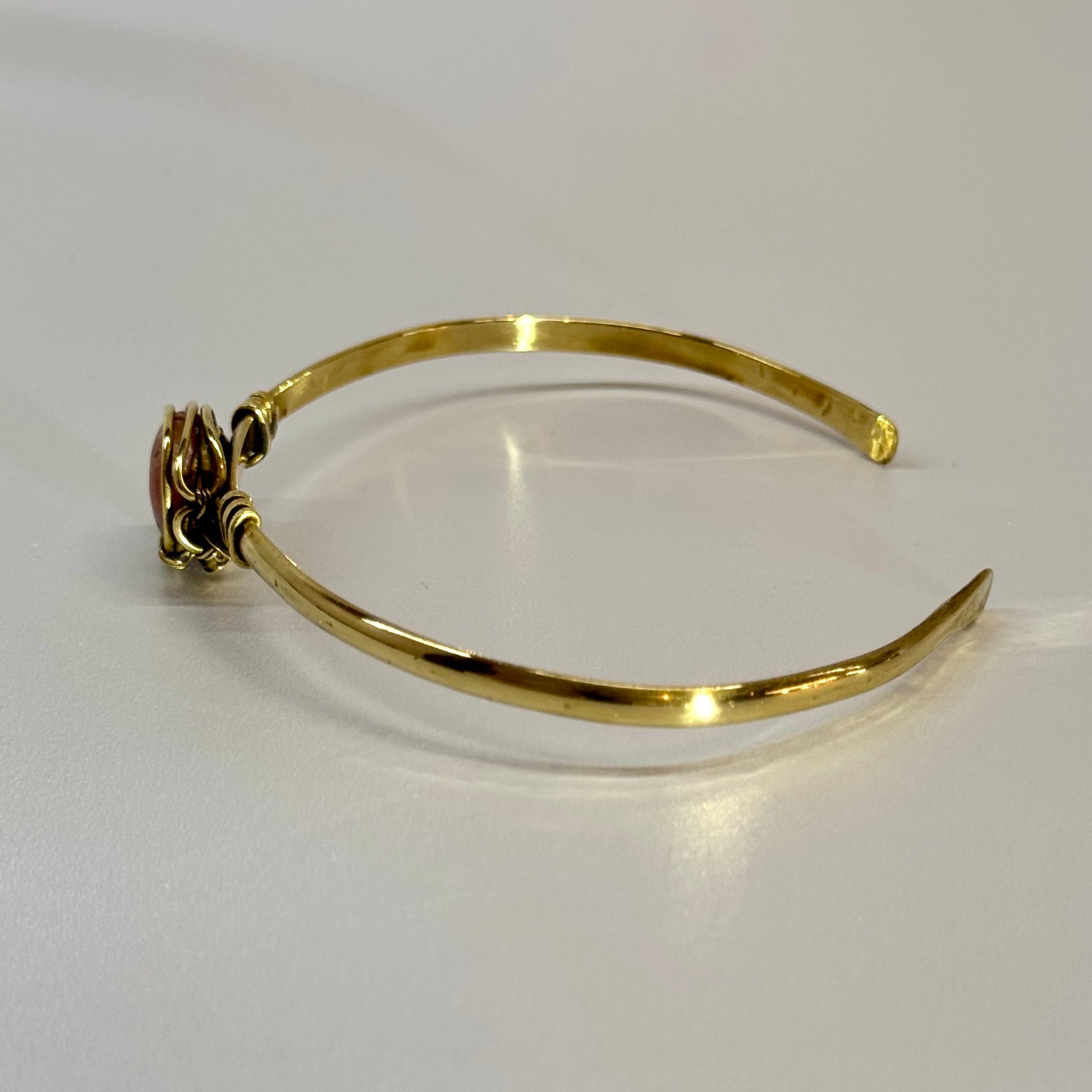 Ce magnifique bracelet est fabriqué à la main dans notre atelier de Playa del Carmen, au Mexique. Chaque pièce est soigneusement confectionnée en laiton, la pierre étant sertie à la main selon la technique du fil enroulé.
