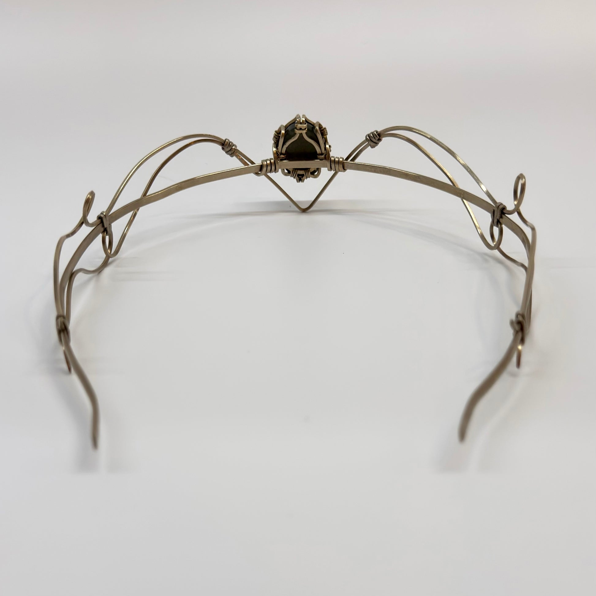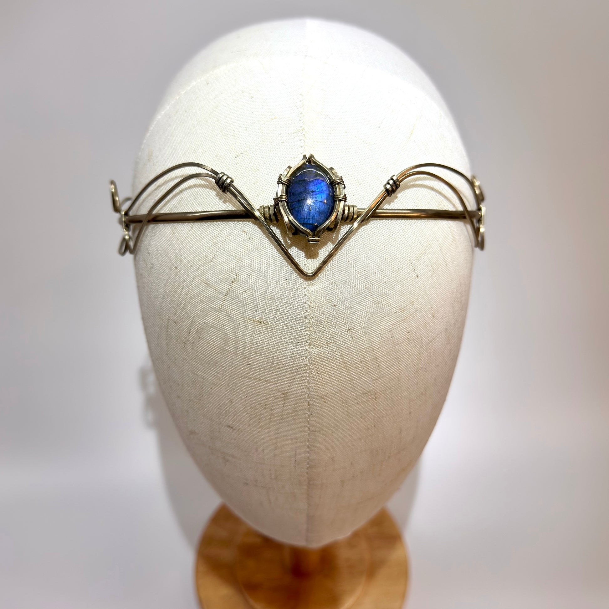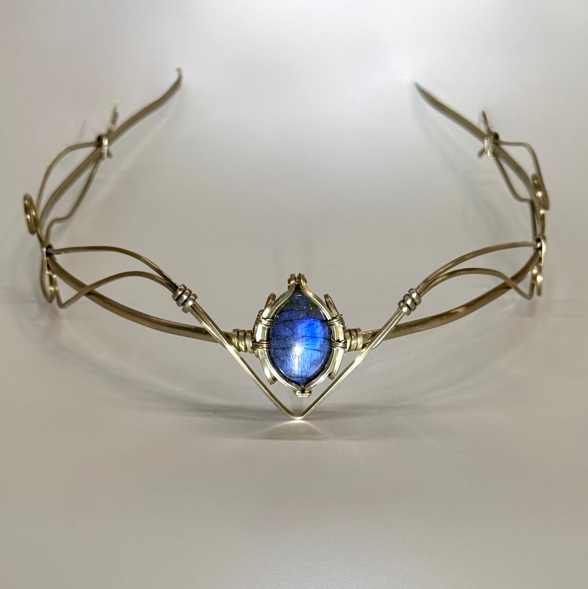 Diadème artisanal en métal alpaga orné de labradorite bleue. Technique du fil enroulé.