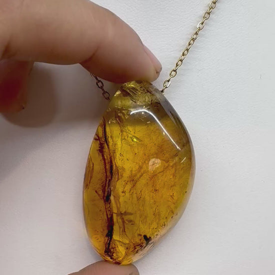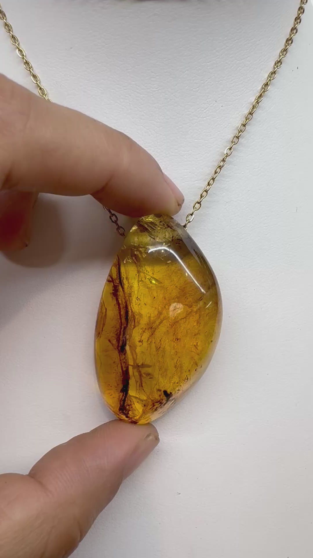 Colgante de ámbar ovalado, con cadena de acero inoxidable bañada en oro.
