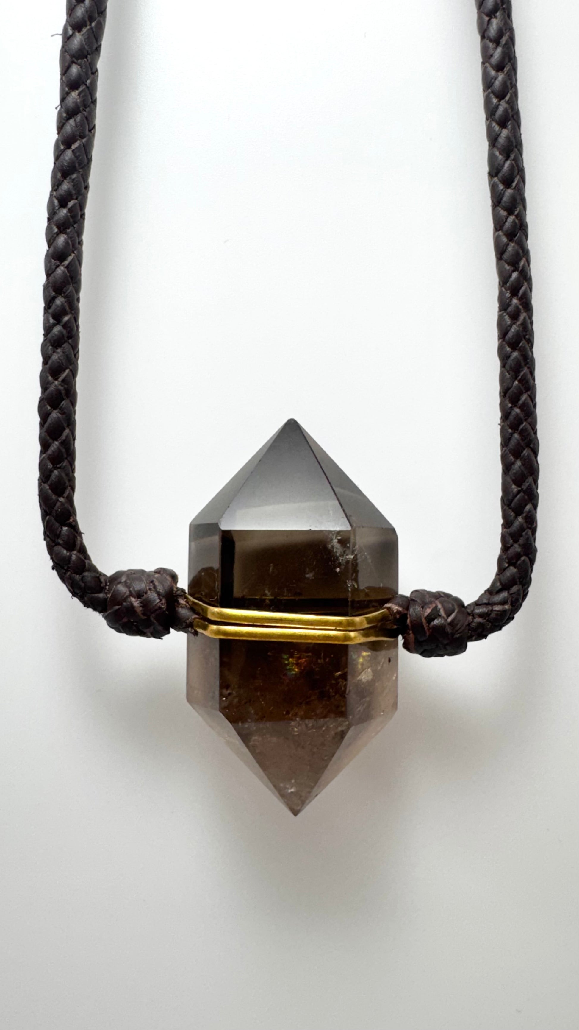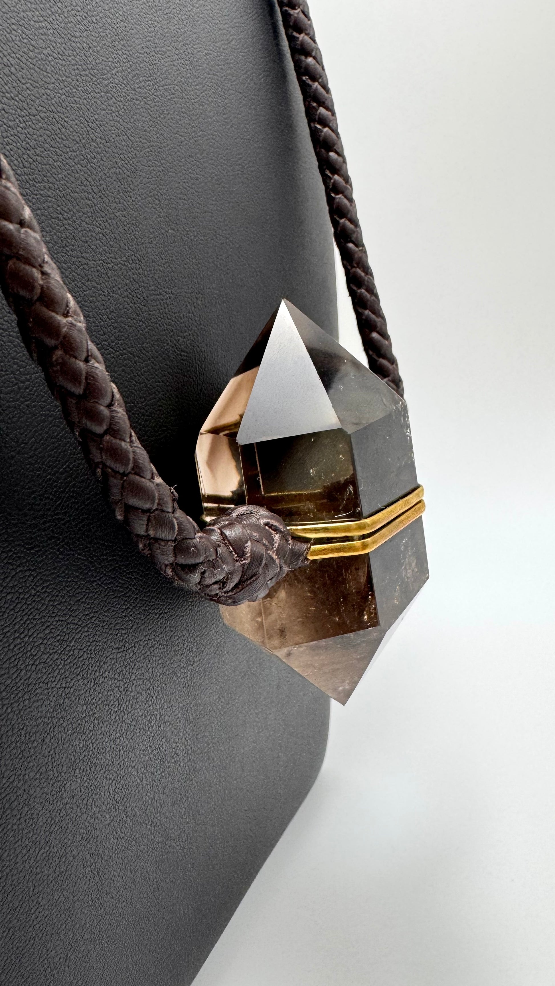 Este collar tiene un obelisco de cuarzo ahumado tallado con seis lados y terminación de doble punta. Su tonalidad es marrón y presenta transparencia. Está engarzado en latón con trenzas hechas a mano de cuero vacuno color marrón oscuro.