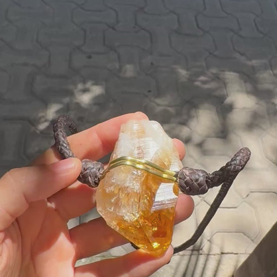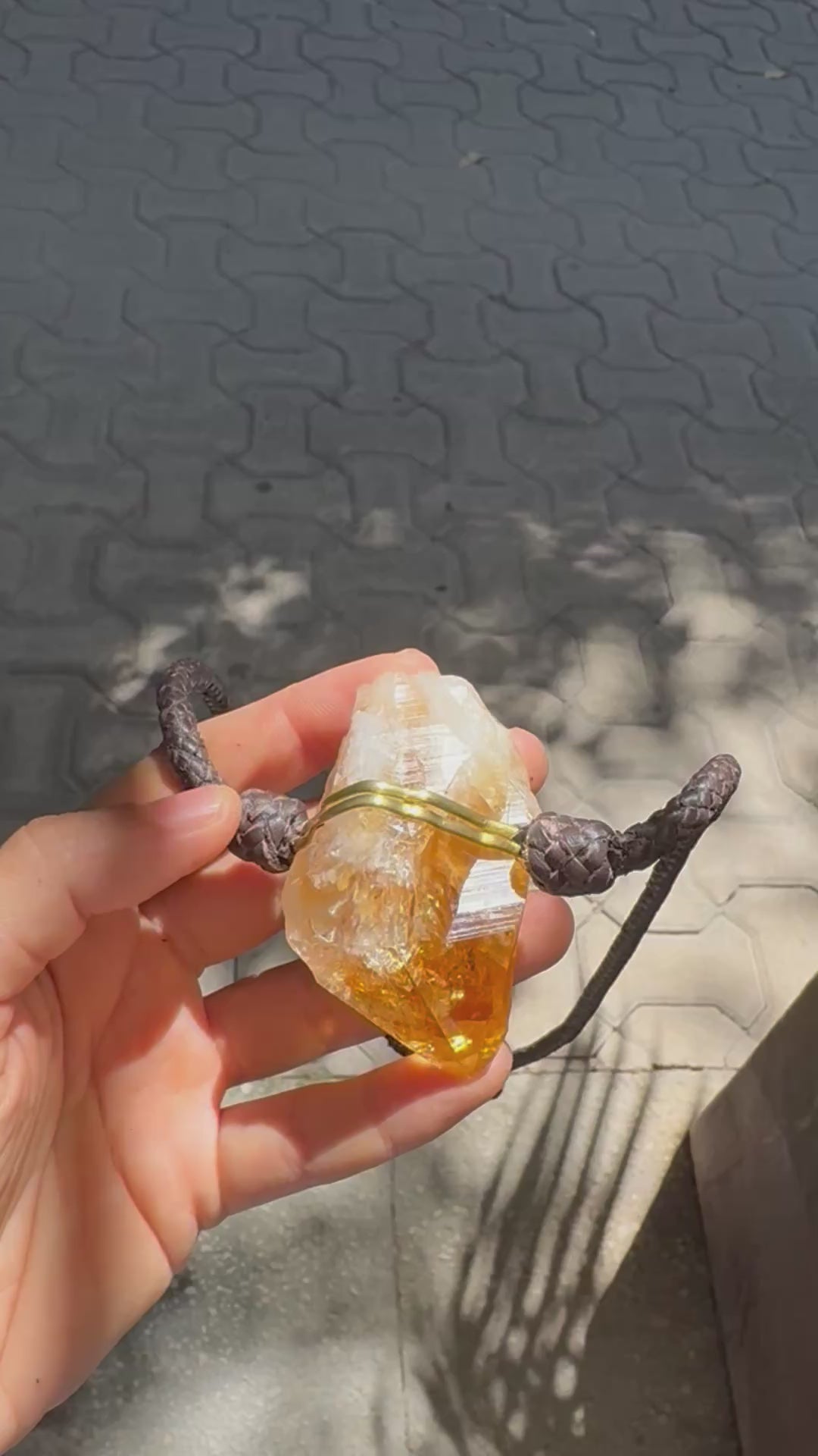 Collar de cuarzo citrino envuelto en latón y trenzado a mano con cuero de vaca legítimo color marrón.