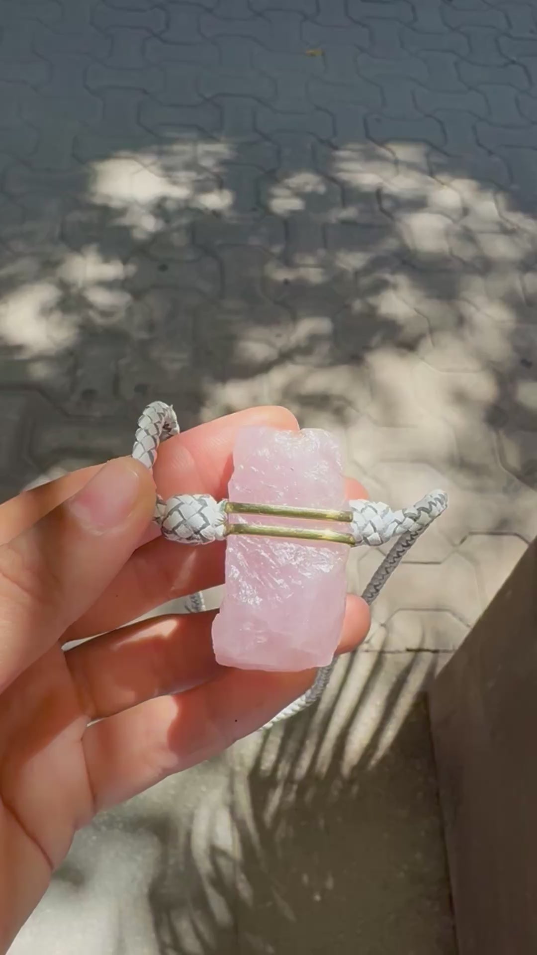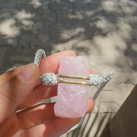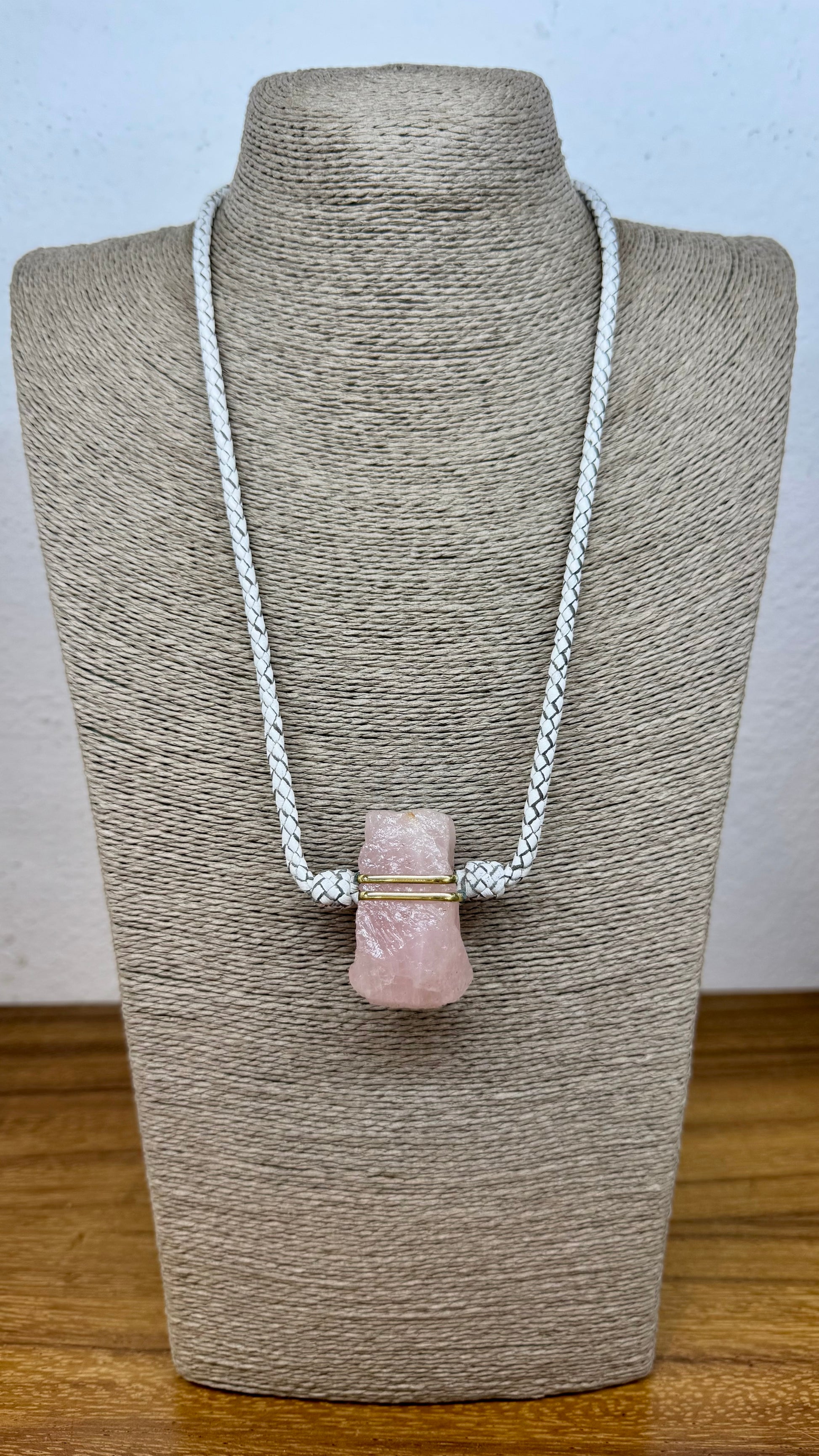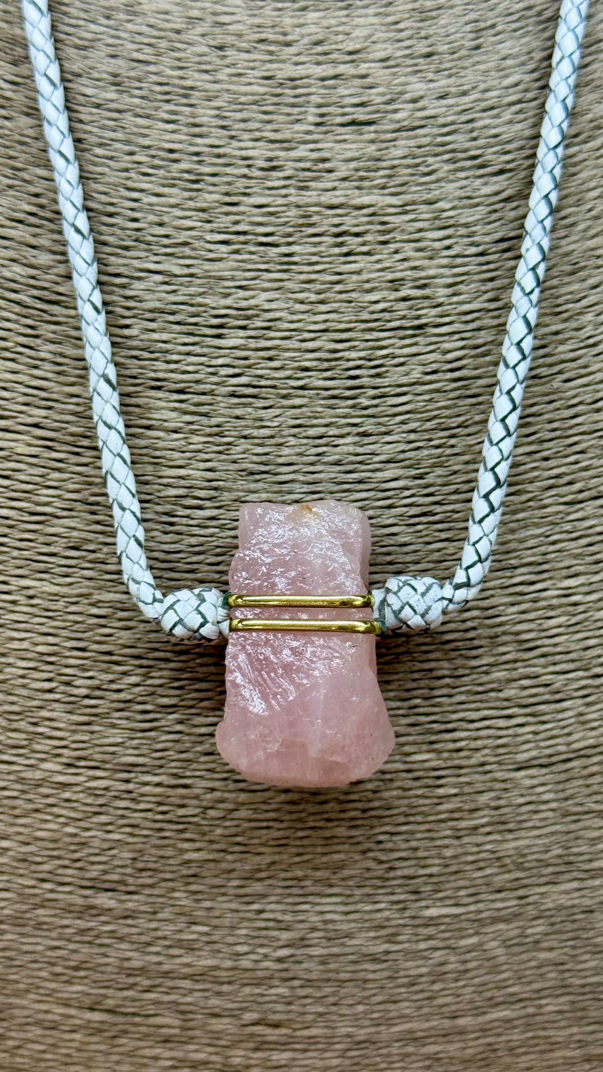 Collar de cuarzo rosa en bruto envuelto en latón, trenza de cuero de vaca color blanco, trenzado a mano.