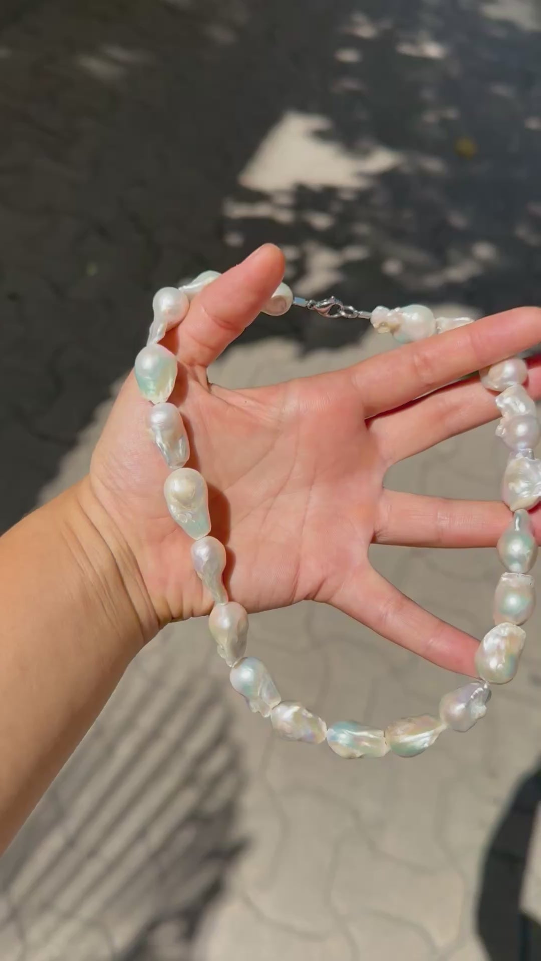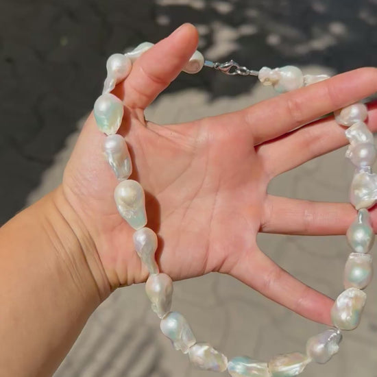 Collar de perlas barrocas ensartado en alambre resistente de acero inoxidable de 7 hebras. Ganchos de acero inoxidable.