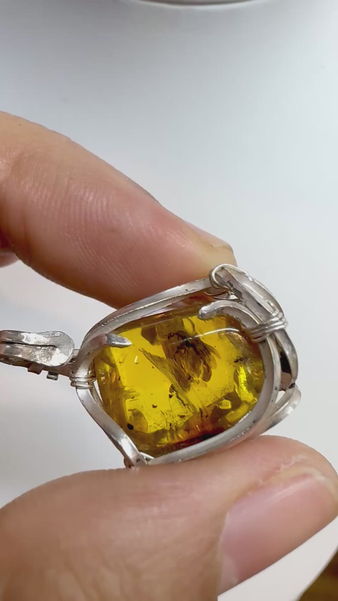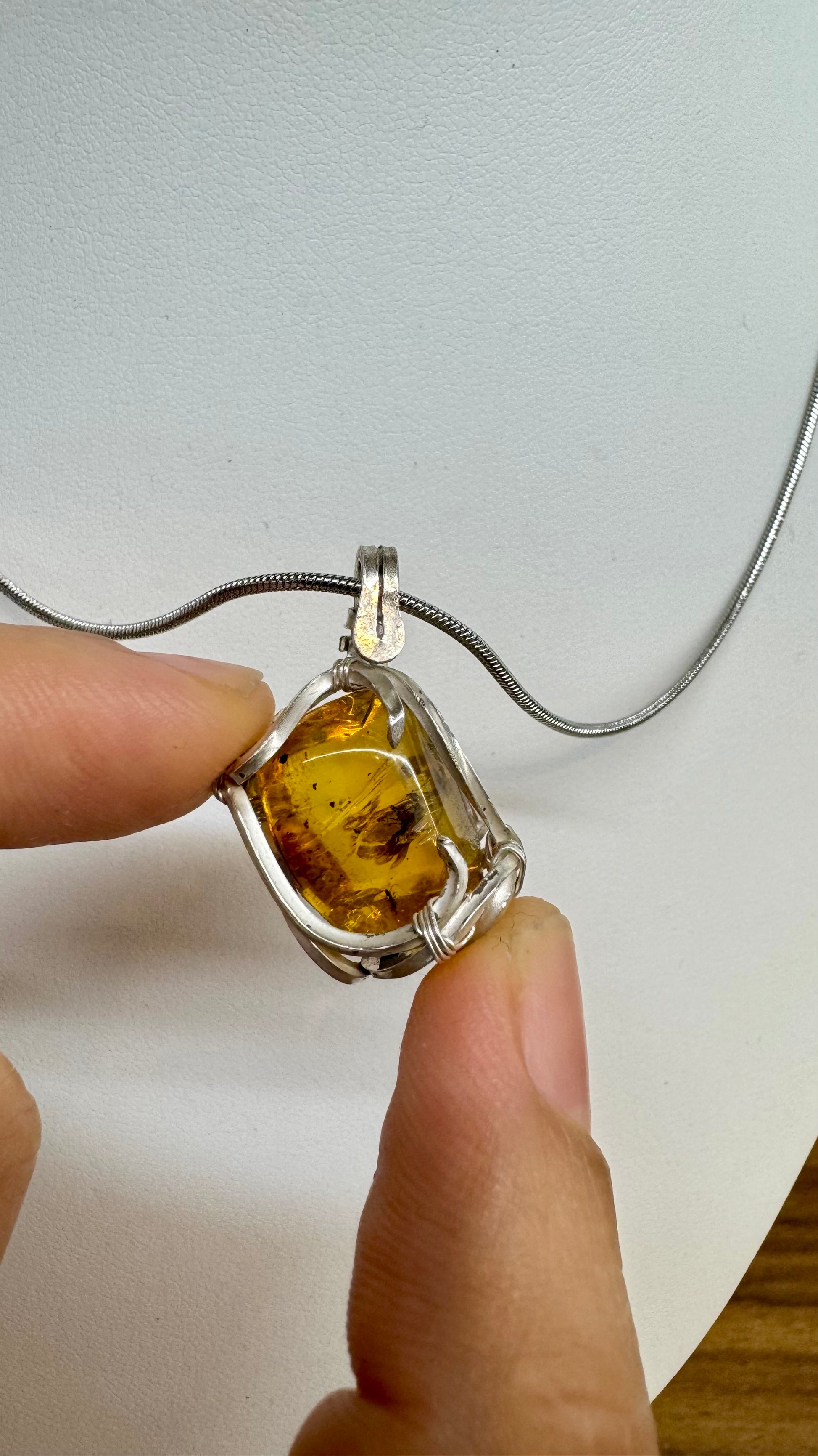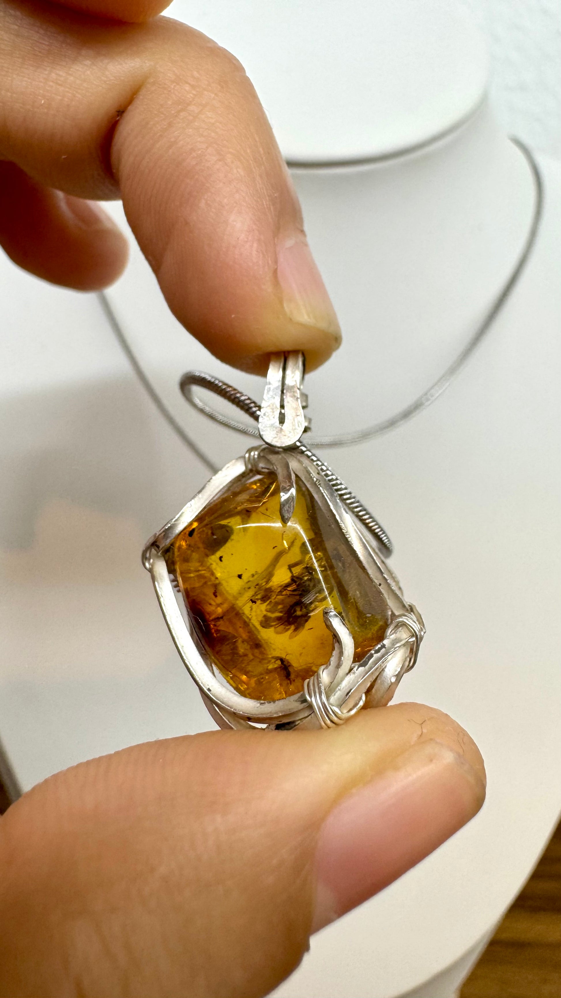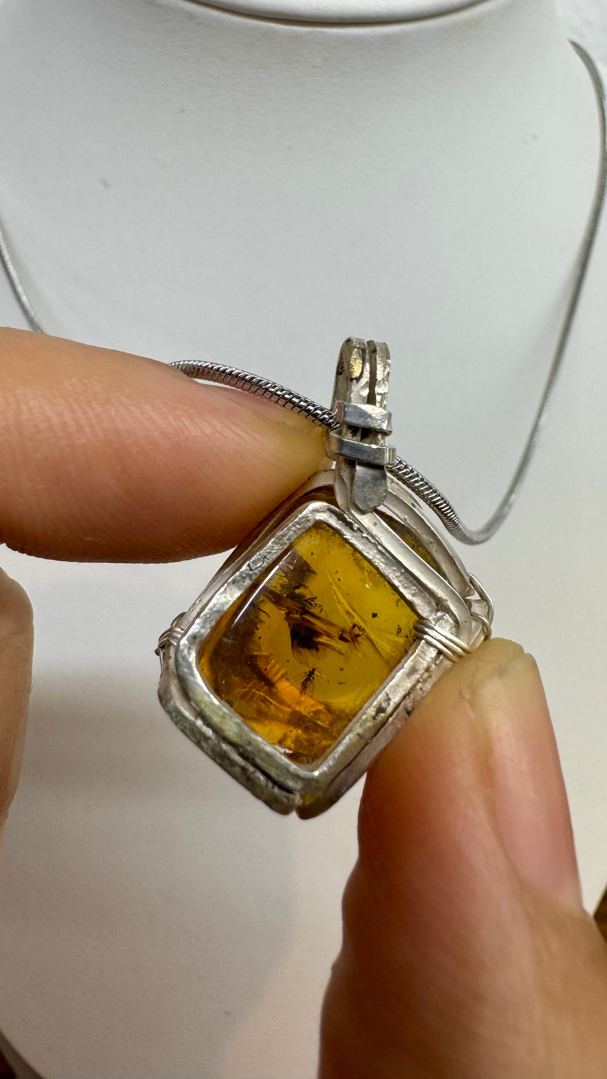 Increíble dije fósil de ámbar con dos insectos. Una mosca primitiva y un pequeño mosquito. Envuelto en plata 950 con cadena de acero inoxidable.
