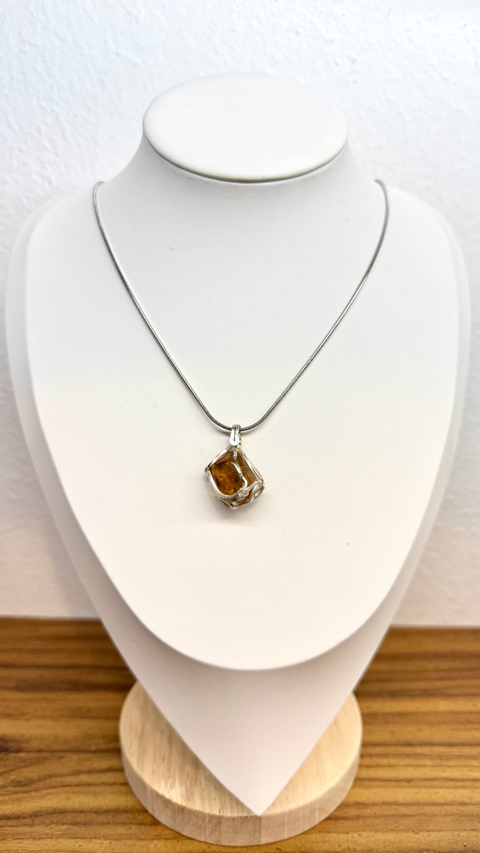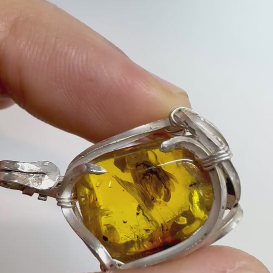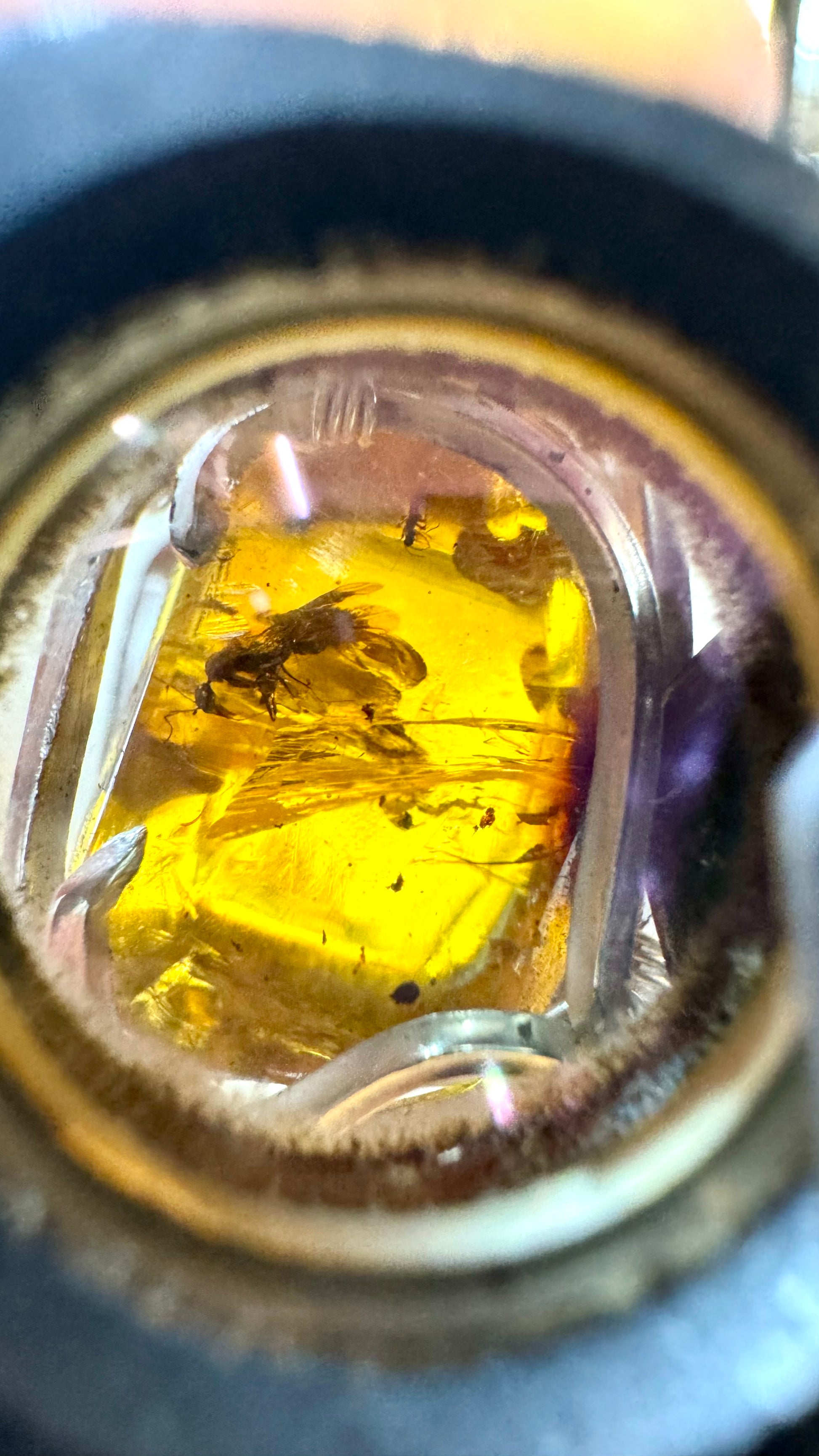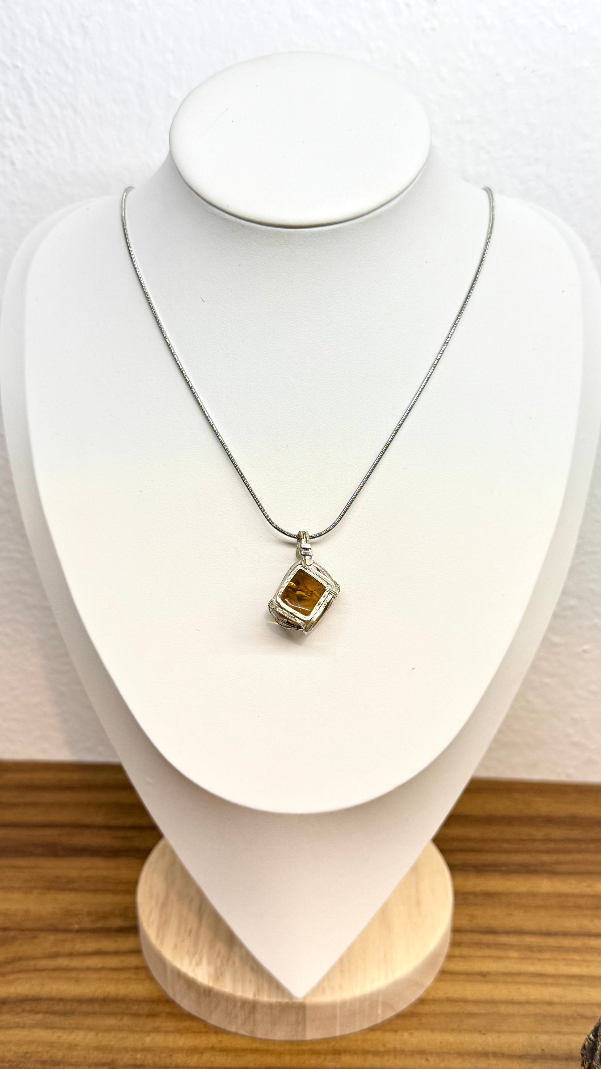 Increíble dije fósil de ámbar con dos insectos. Una mosca primitiva y un pequeño mosquito. Envuelto en plata 950 con cadena de acero inoxidable.