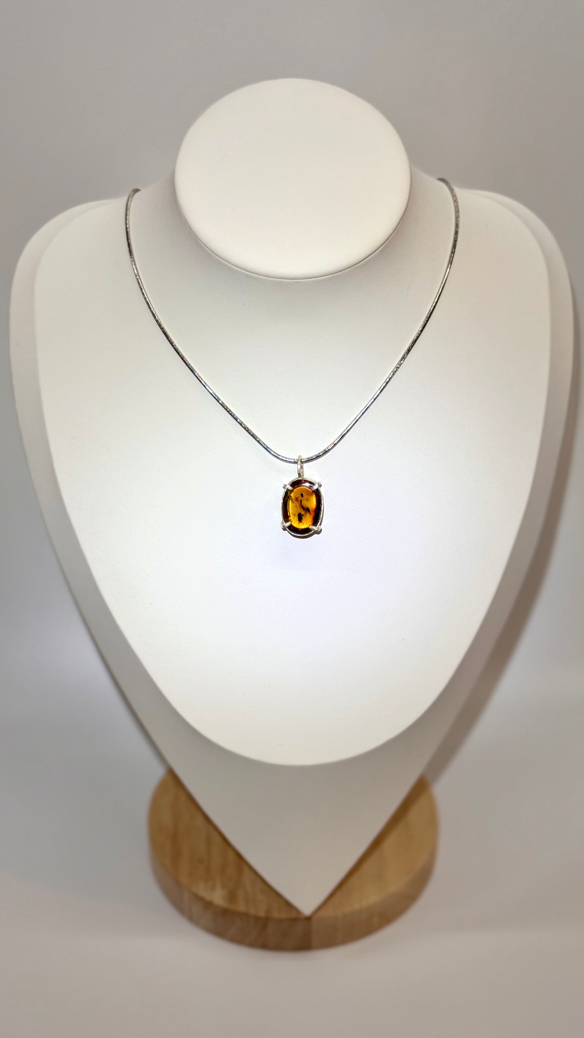 El ámbar presenta un hermoso tono miel translúcido, con inclusiones orgánicas naturales que refuerzan su autenticidad y origen fósil.