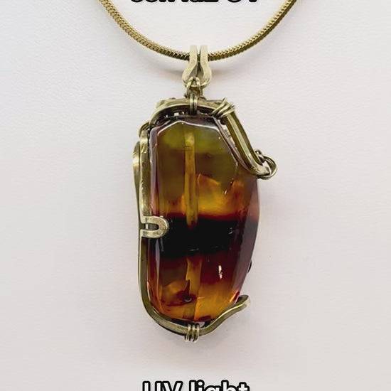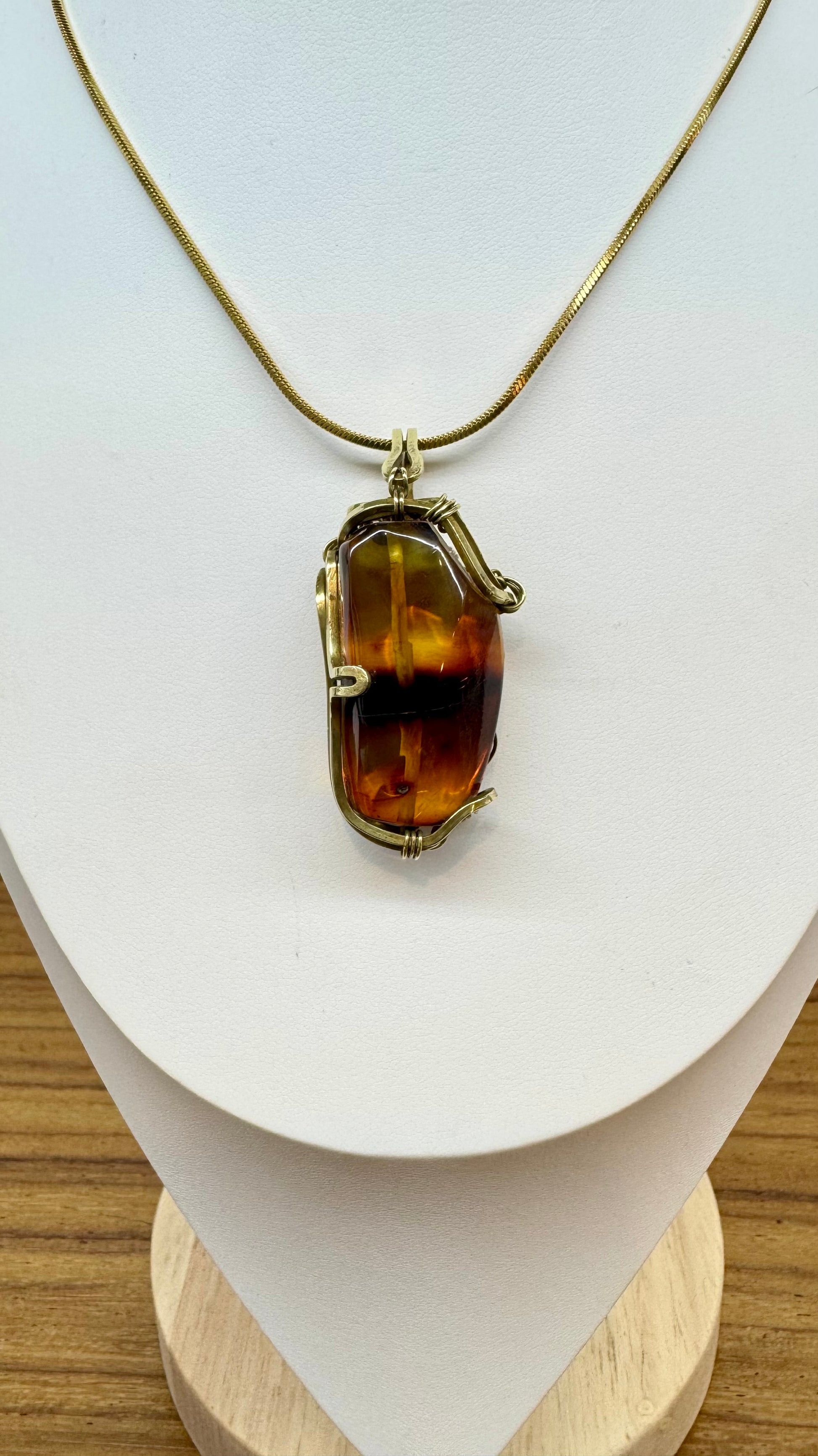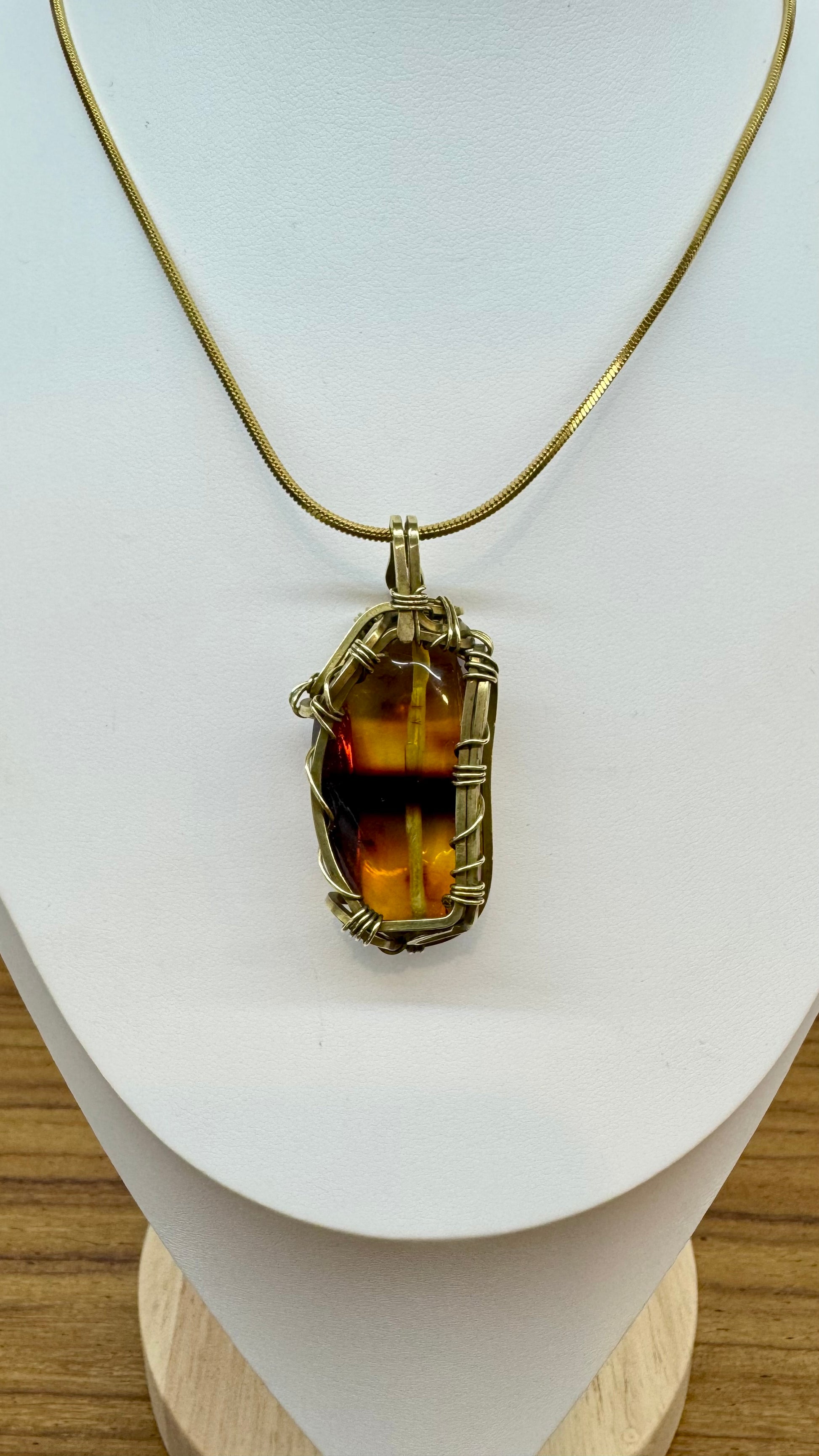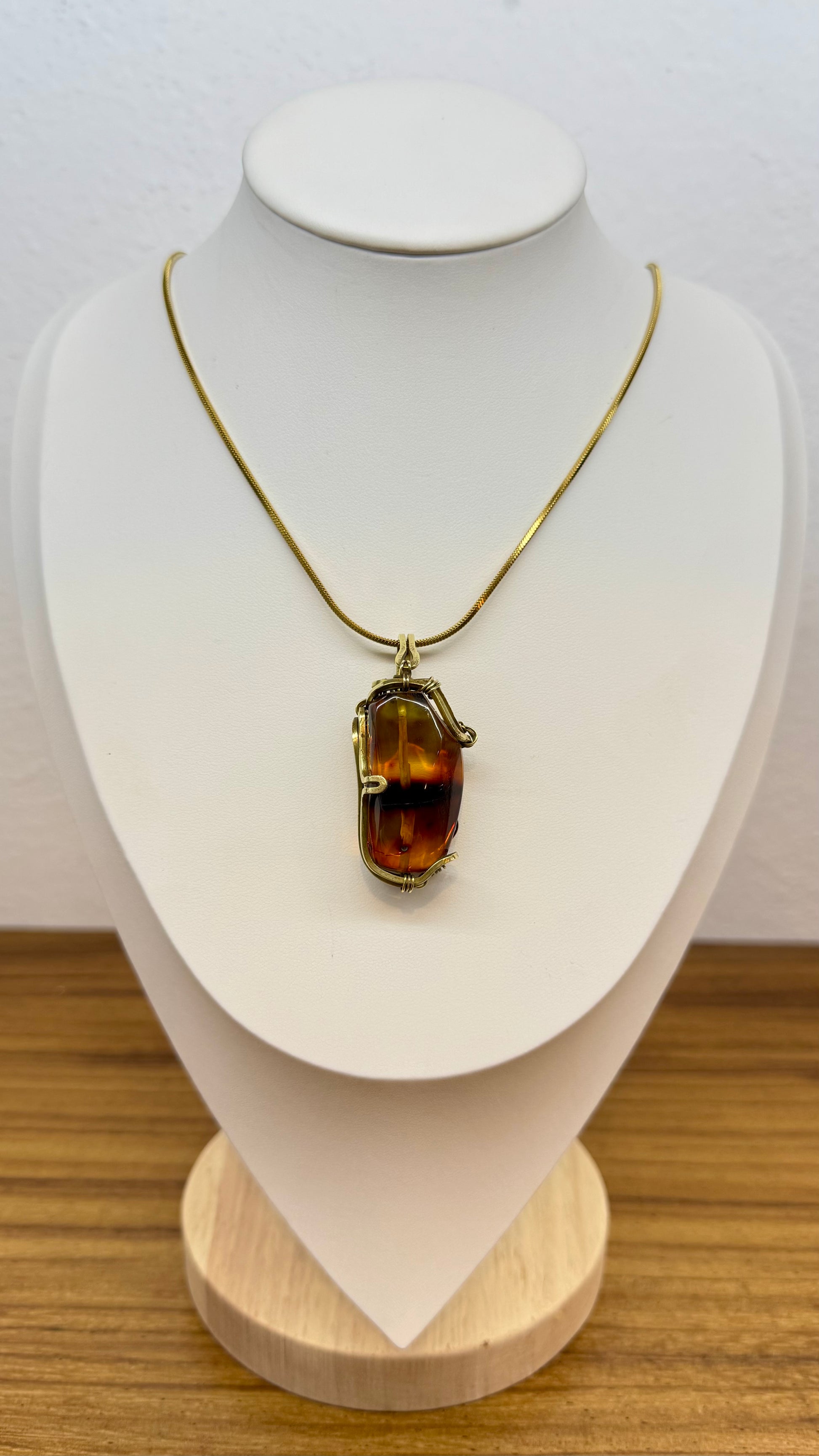 Colgante de ámbar rojo con alambre de latón y cadena de acero inoxidable bañada en oro.