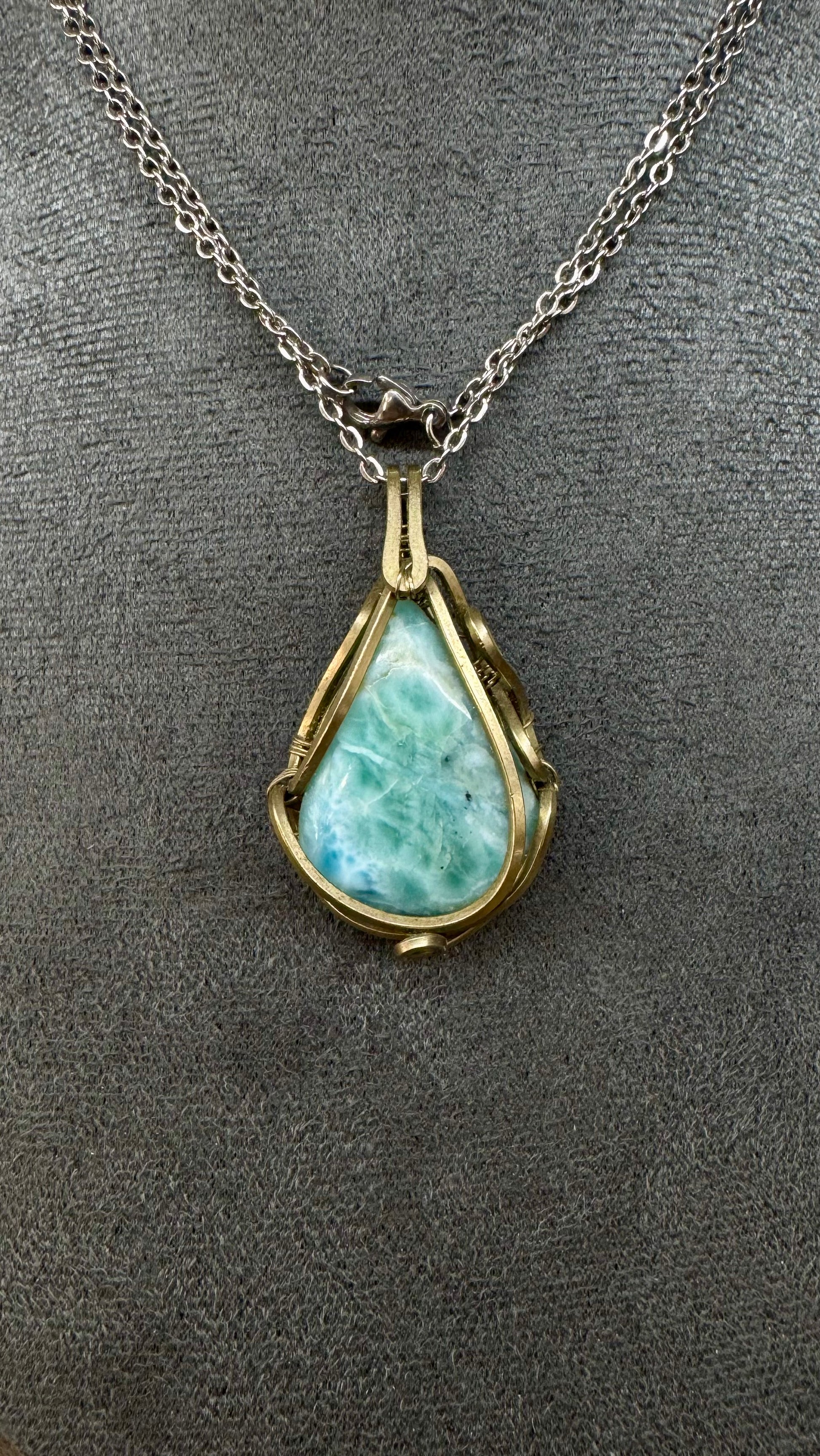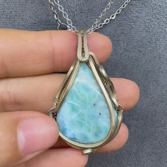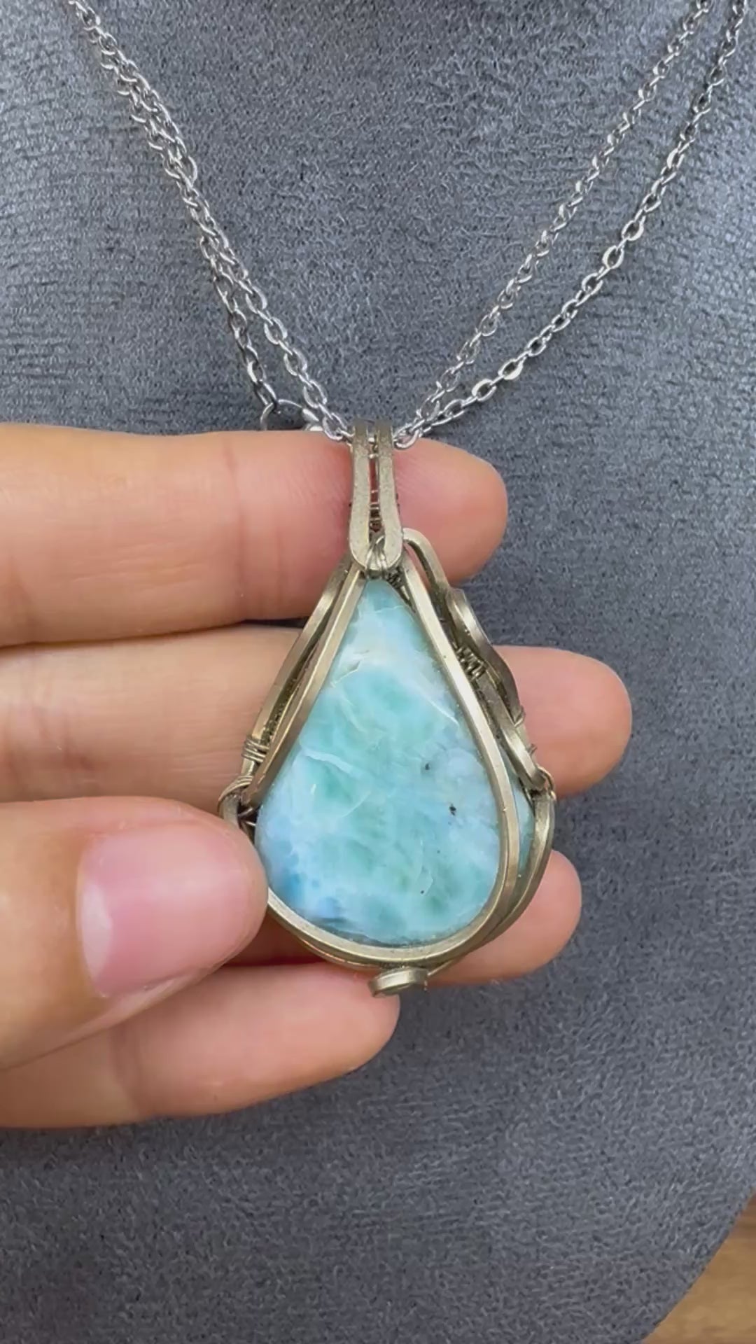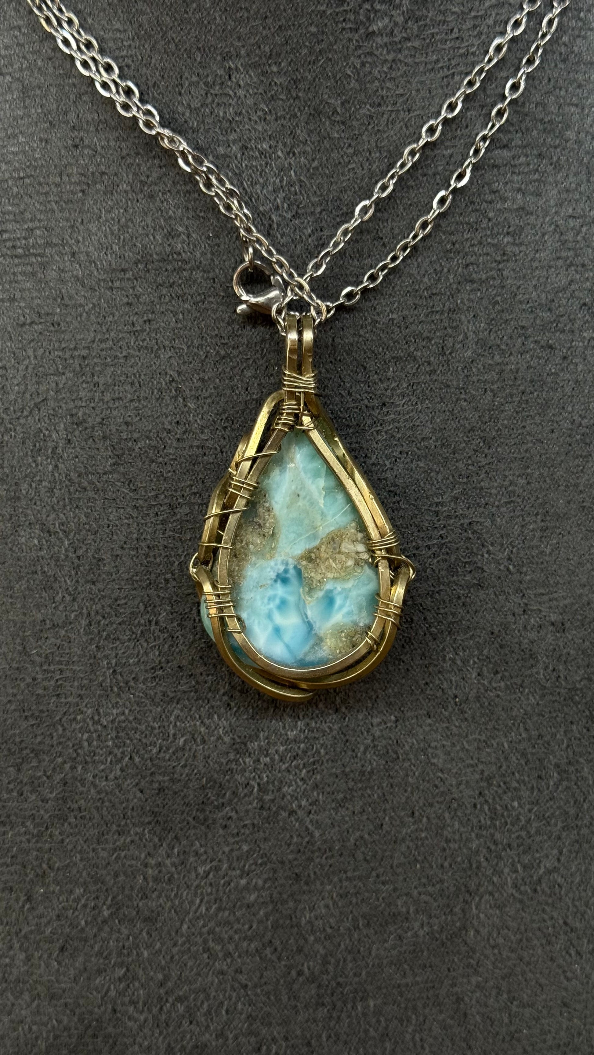 Colgante de larimar hecho a mano, envuelto en alpaca con cadena de acero inoxidable.