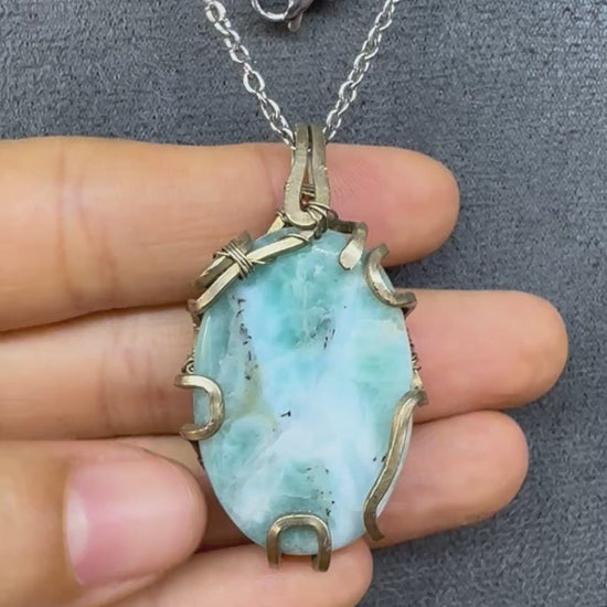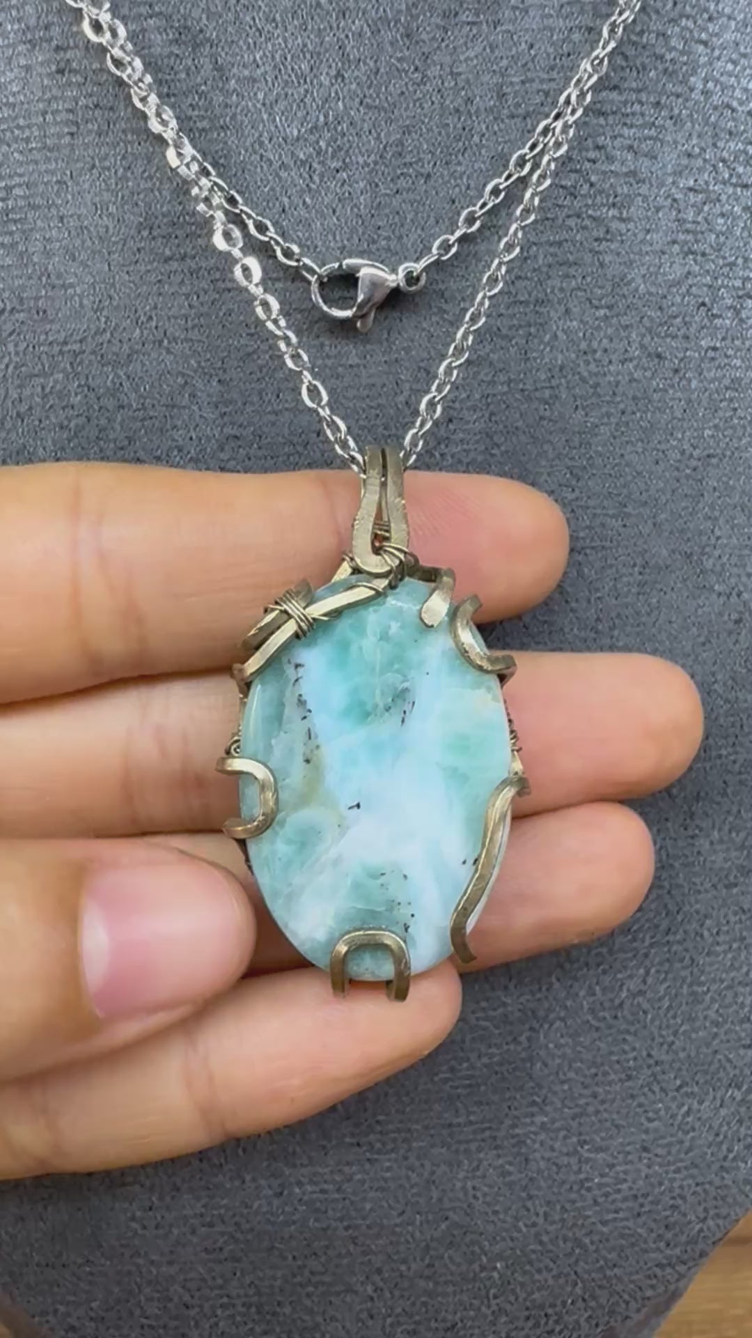 Colgante de larimar envuelto en alpaca. Cadena de acero inoxidable. Hecho a mano.