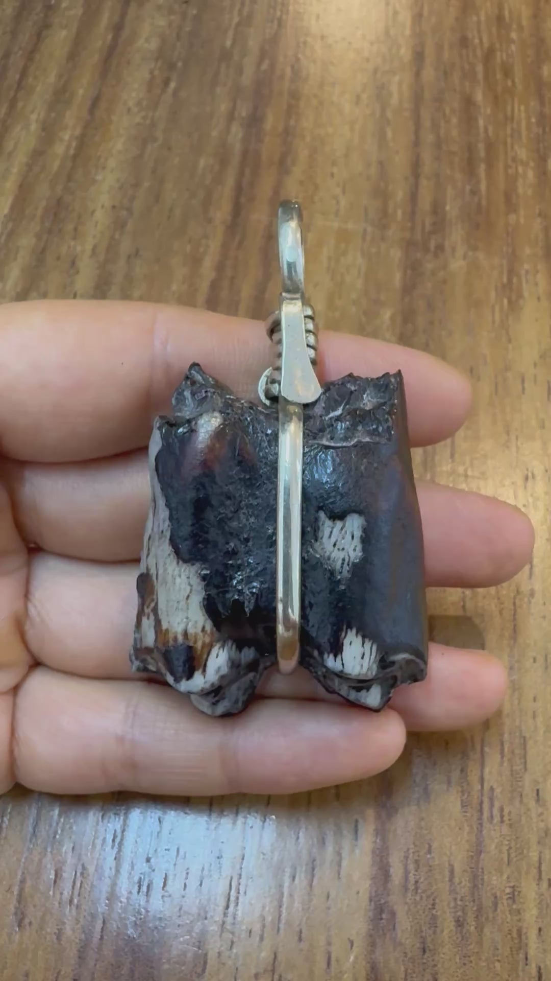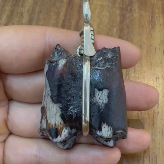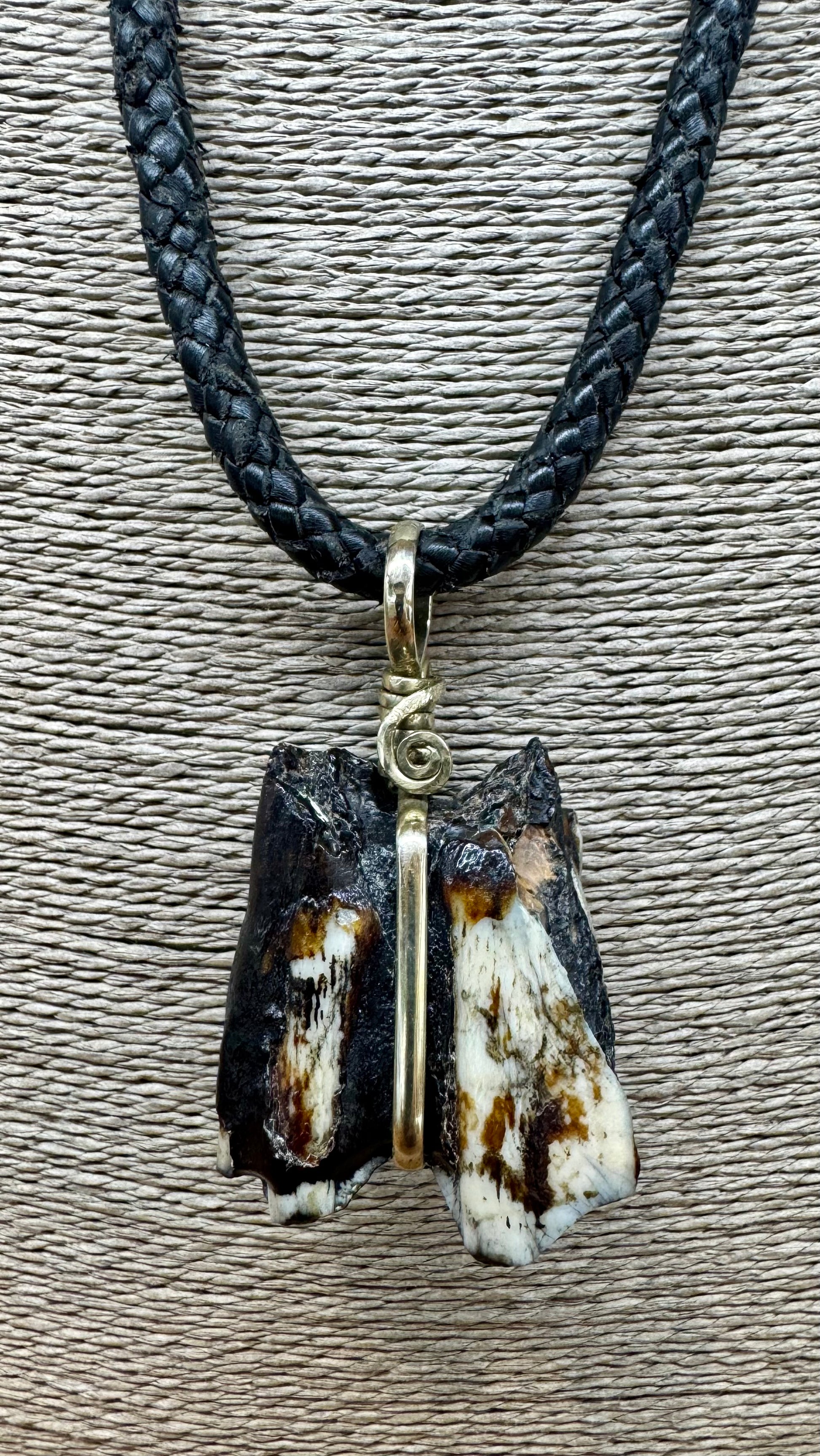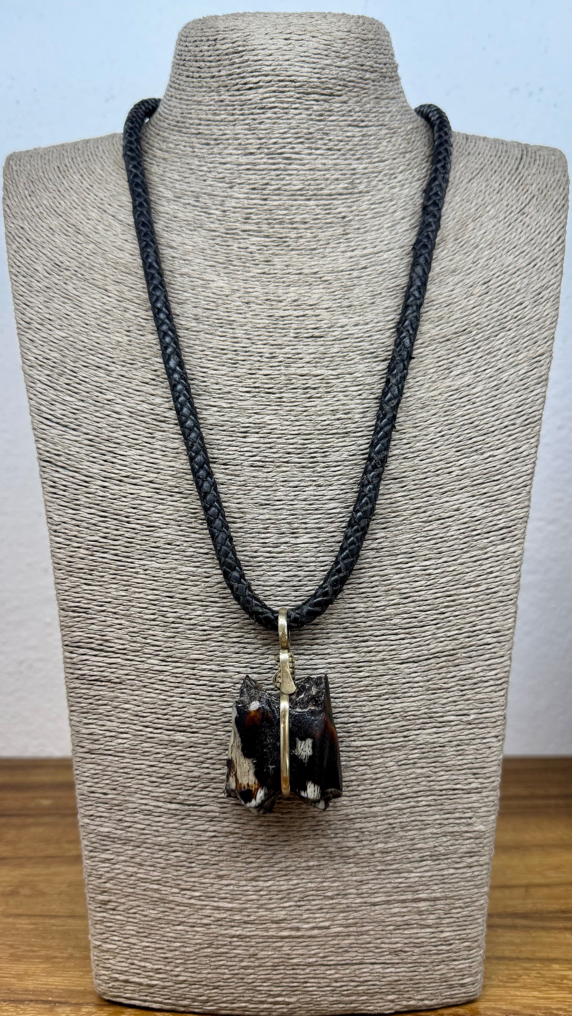 Increíble muela fosilizada de Okapi, engarzada en alpaca, con collar trenzado a mano de cuero de vaca.