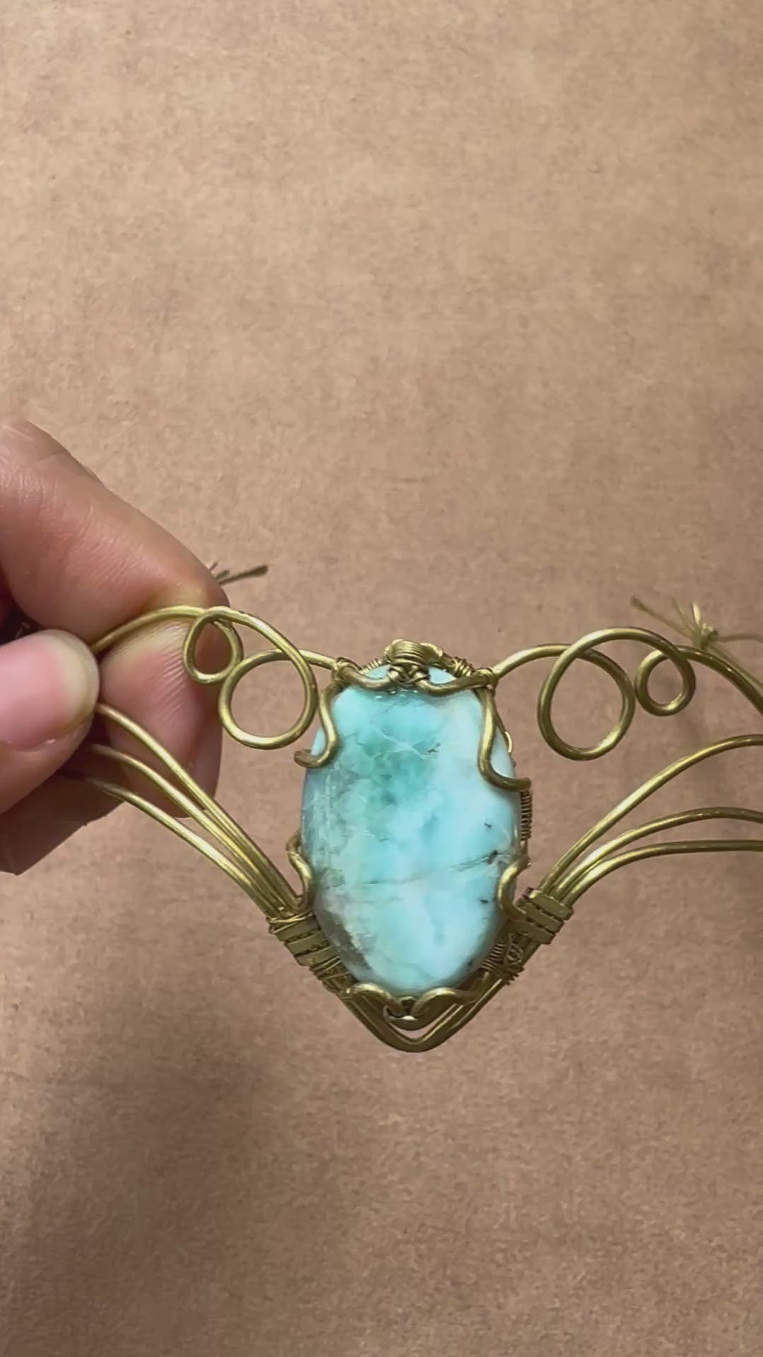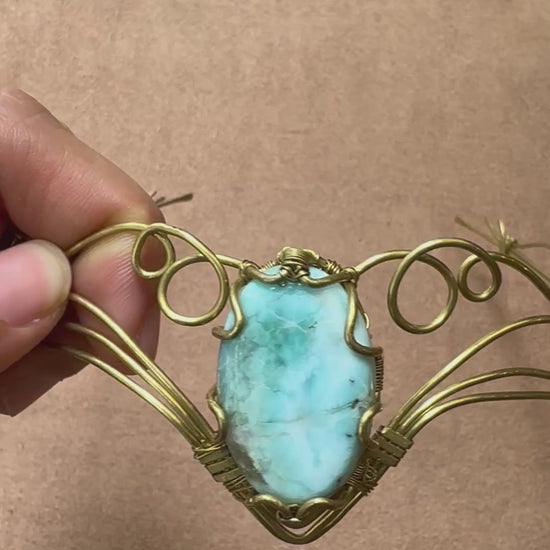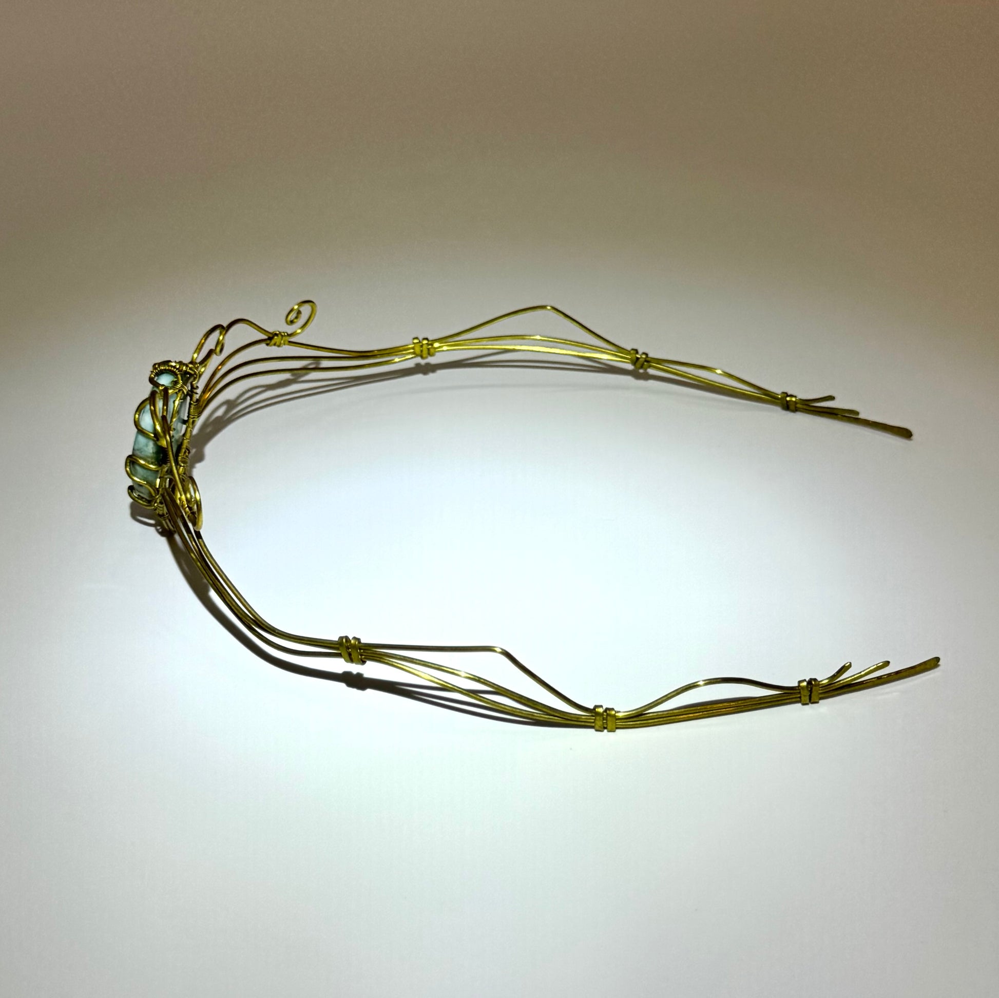 Tiara o corona de larimar hecha a mano en latón. Técnica wire wrap. Ajustable a cualquier medida de cabeza.