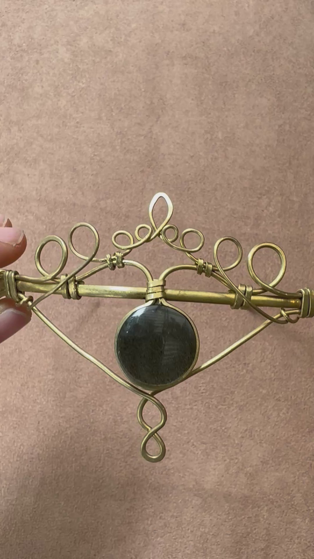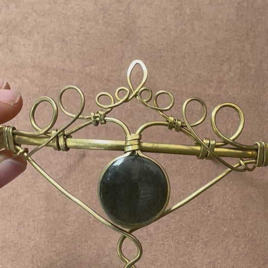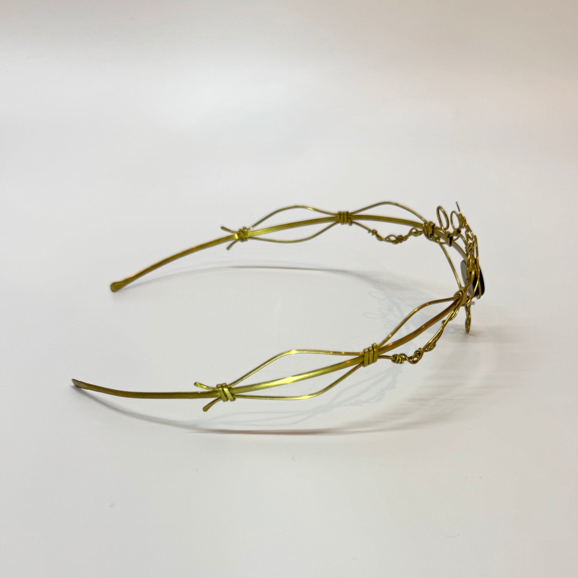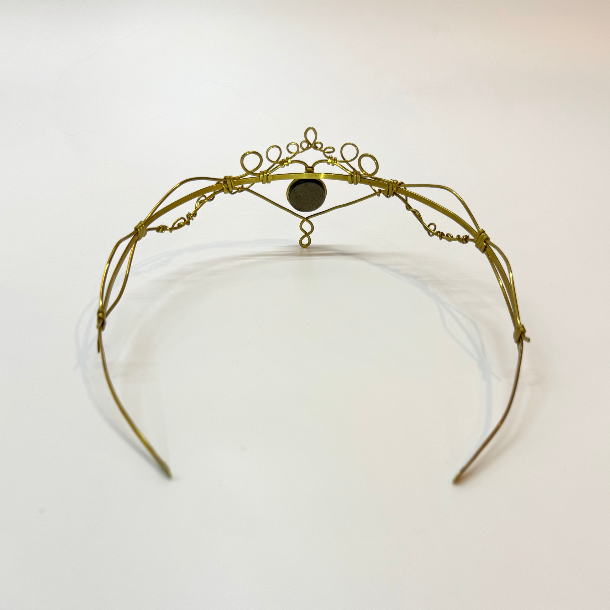 Tiara o corona de obsidiana dorada hecha a mano en metal latón. Técnica wire wrapping. Es ajustable a cualquier medida de cabeza.